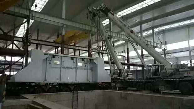 青岛泰力起重安装有限公司动用三台110吨 1台130吨吊车联手配合抬装190吨德国进口设备助力一汽大众奥迪设备搬运吊装安装现场。